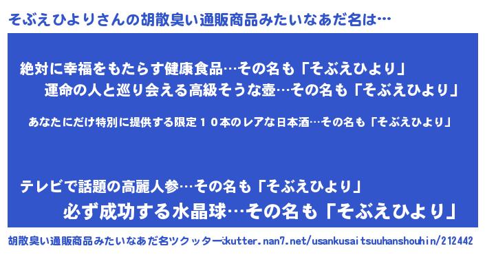 | 男性向けラノベタイトル風あだ名 | 『そぶえひより~年齢イコール彼女いない歴の魔法使い~』 |