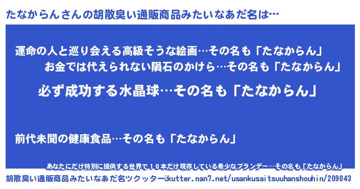 | 男性向けラノベタイトル風あだ名 | 『たなからんの憂鬱』 |