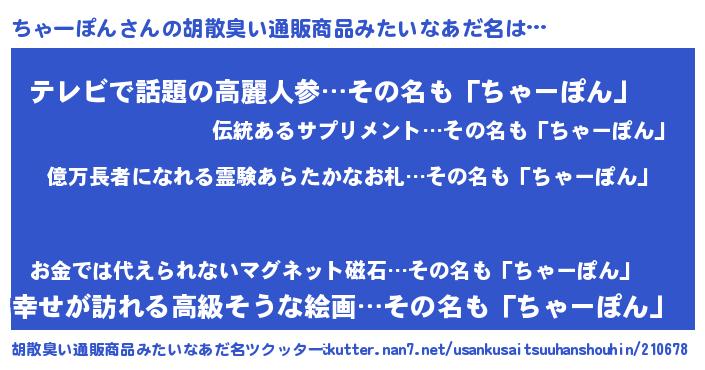 | 男性向けラノベタイトル風あだ名 | 『ちゃーぽんに滅ぼされるだけの簡単なお仕事です』 |