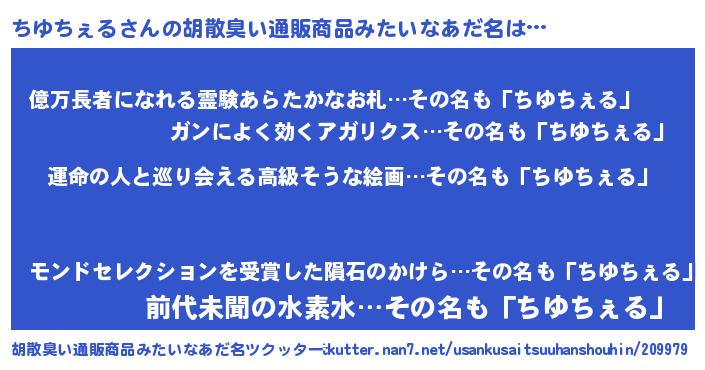 | 男性向けラノベタイトル風あだ名 | 『ちゆちぇる~年齢イコール彼女いない歴の魔法使い~』 |
