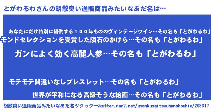 | 女子向けラノベタイトル風あだ名 | 『とがわるわなんてお断りですっ。』 |