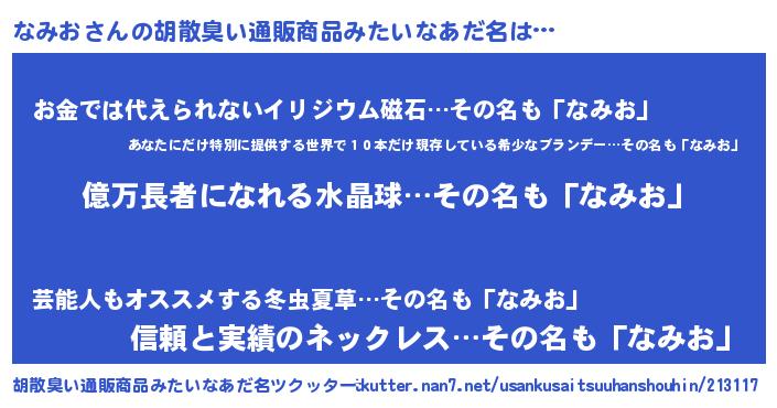 | ヘコむあだ名 | 『なみにゅー』『なみっぺ』『豆乳』 |