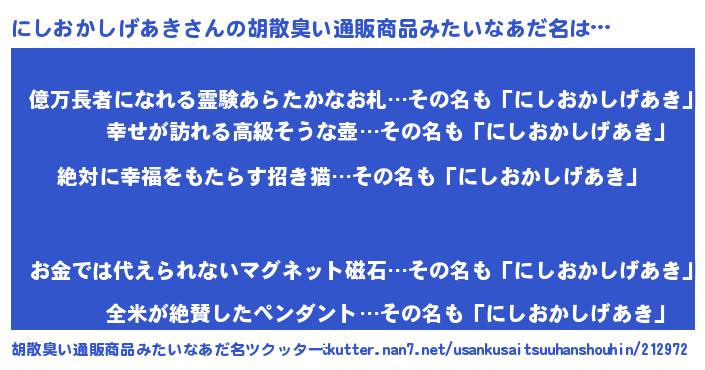 | 肩書あだ名 | 『にしおかしげあき少佐』 |