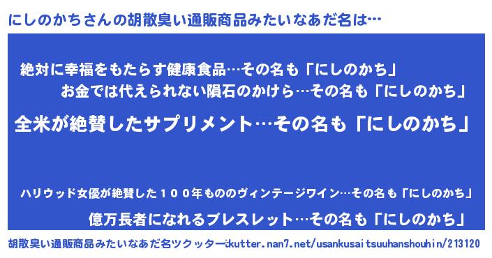 | 意味不明あだ名 | 『とにかく怪しいにしのかち』 |