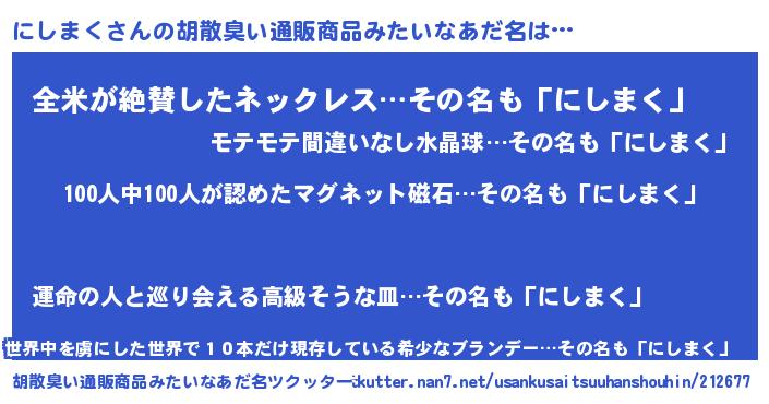 | 男性向けラノベタイトル風あだ名 | 『おまえをオタクにしてやるから、俺をにしまくにしてくれ! 』 |