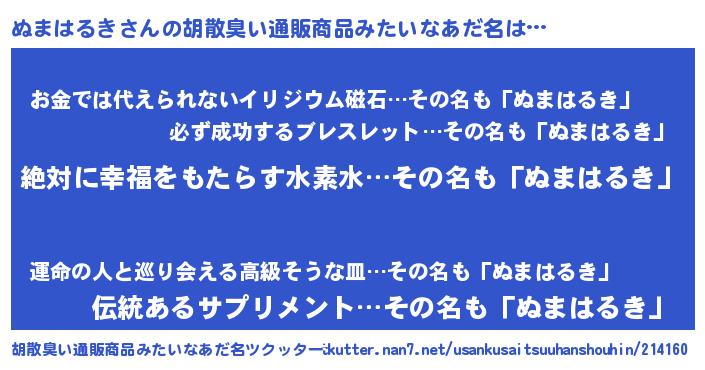 | 男性向けラノベタイトル風あだ名 | 『ぬまはるきという概念が存在しない退屈な世界 』 |