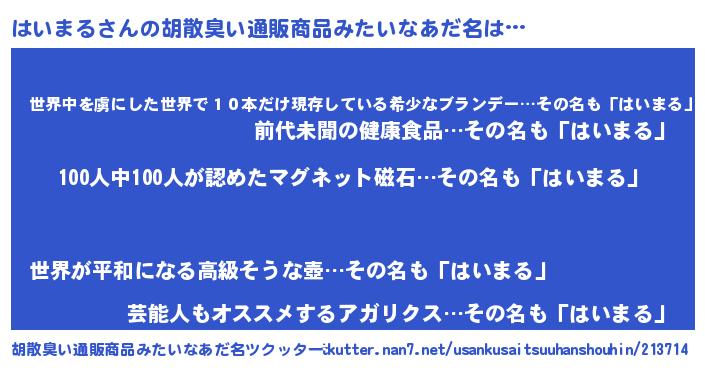 | ヘコむあだ名 | 『はいまる(小並感)』『つくし』 |