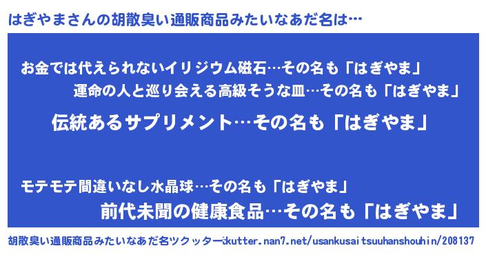 | ヘコむあだ名 | 『はぎ太郎』『はぎやま(小並感)』 |