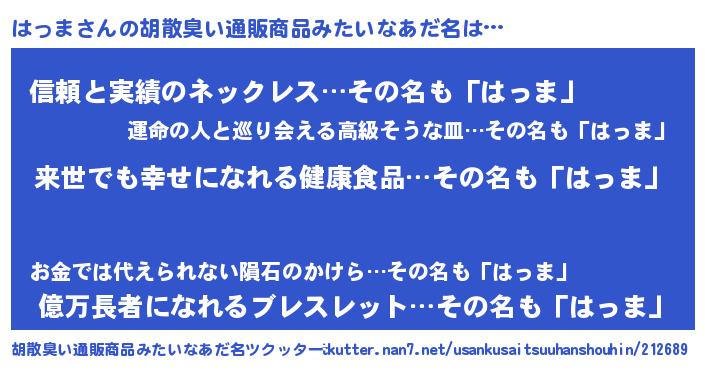 | 男性向けラノベタイトル風あだ名 | 『はっまという概念が存在しない退屈な世界 』 |