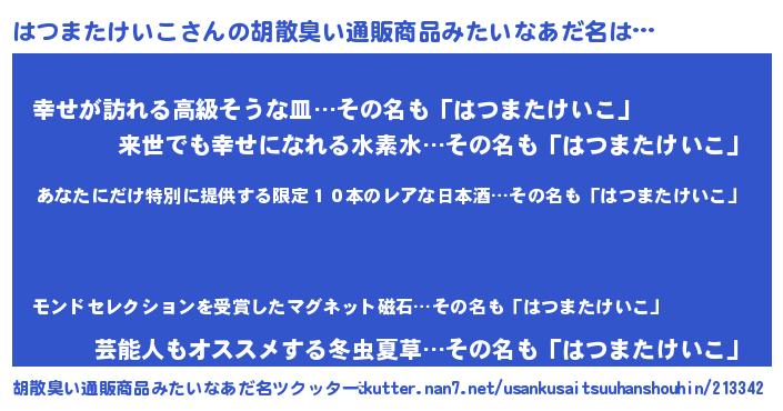 | 男性向けラノベタイトル風あだ名 | 『うちのはつまたけいこが世界を掌握している!』 |