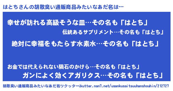 | 男性向けラノベタイトル風あだ名 | 『はとちという概念が存在しない退屈な世界 』 |
