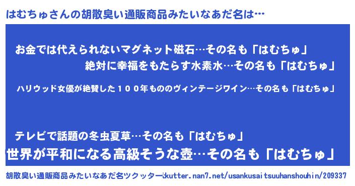 | 意味不明あだ名 | 『住所不定無職はむちゅ(1歳)』 |