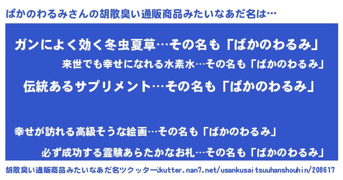 | 男性向けラノベタイトル風あだ名 | 『ばかのわるみに滅ぼされるだけの簡単なお仕事です』 |
