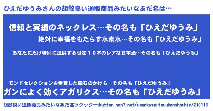 | 意味不明あだ名 | 『住所不定無職ひえだゆうみ(56歳)』 |