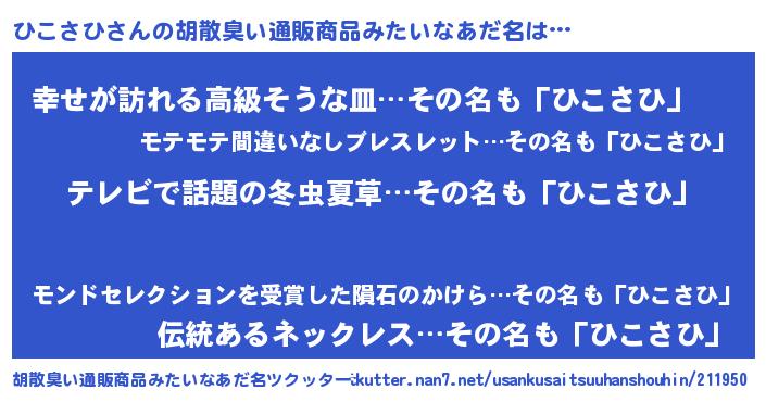 | 男性向けラノベタイトル風あだ名 | 『Re:ひこさひから始める異世界生活』 |