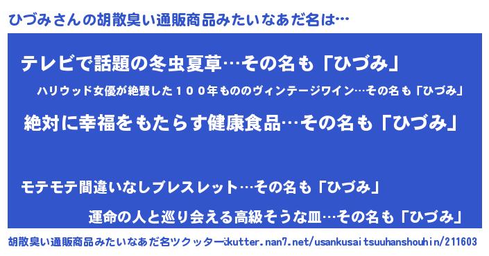 | ヘコむあだ名 | 『ひづみ(爆)』『なまこ酢』 |