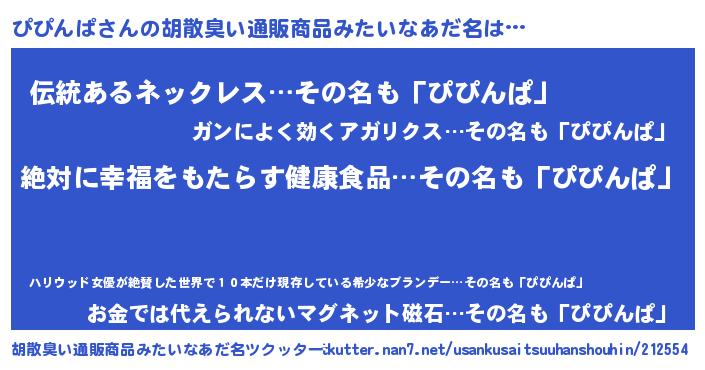 | 男性向けラノベタイトル風あだ名 | 『ぴぴんぱという概念が存在しない退屈な世界 』 |