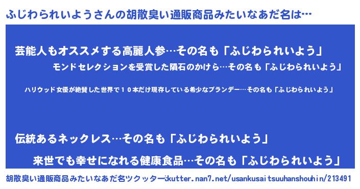 | ヘコむあだ名 | 『ふじわられいよう(遠い目)』『ふじお』 |