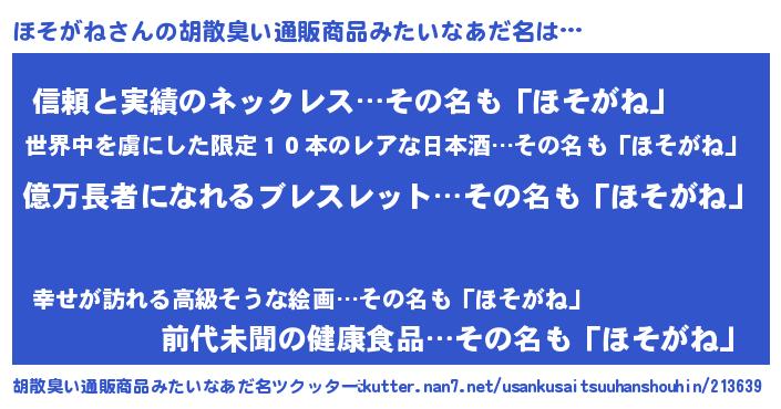 | 意味不明あだ名 | 『ペロリンほそがね』『永久保存ほそがね』 |