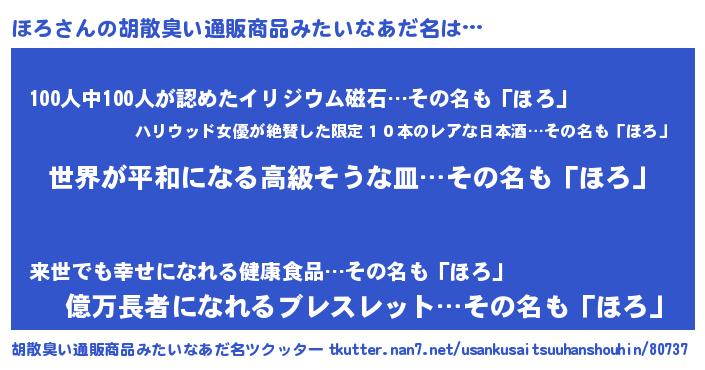 | ヘコむあだ名 | 『豆乳』『ほろふぇ~』『ほろ太郎』 |