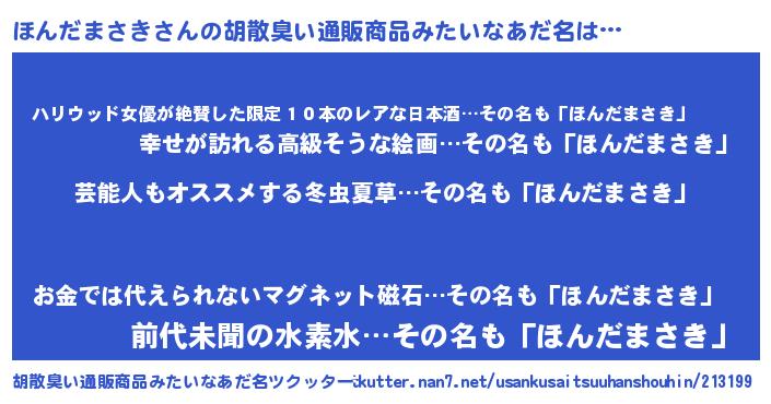 | 男性向けラノベタイトル風あだ名 | 『Re:ほんだまさきから始める異世界生活』 |