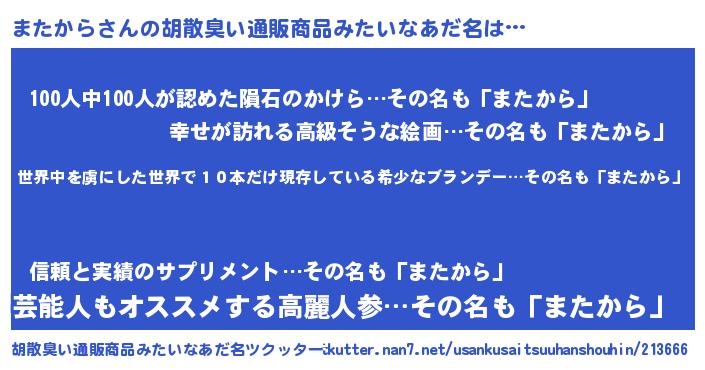 | ヘコむあだ名 | 『なまこ酢』『またっぺ』『またもー』 |
