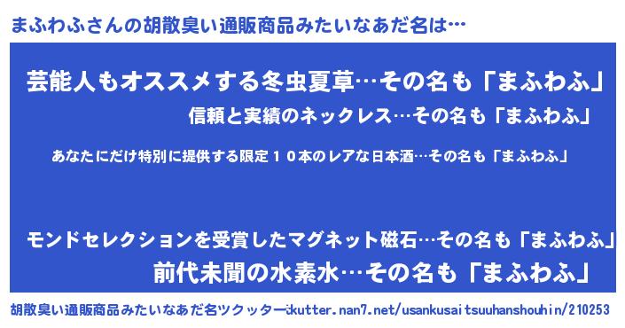 | ヘコむあだ名 | 『まふわふ(笑)』『まふ太郎』『豆乳』 |