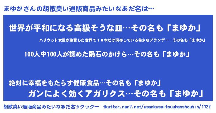 | 意味不明あだ名 | 『眠気覚ましガムまゆか味』『自称まゆか』 |