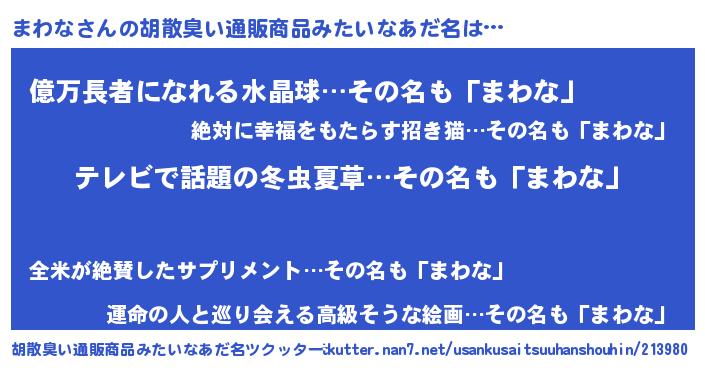 | 意味不明あだ名 | 『自称まわな』『ペロリンまわな』 |