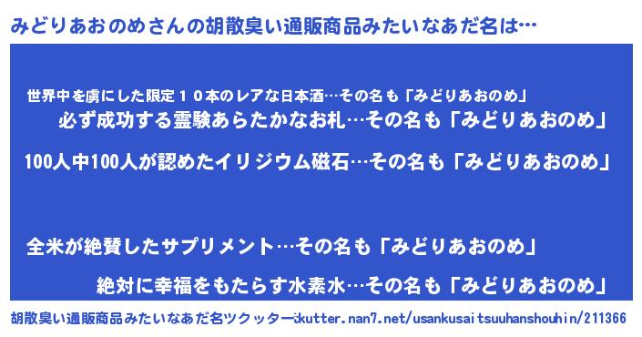 | 男性向けラノベタイトル風あだ名 | 『おまえをオタクにしてやるから、俺をみどりあおのめにしてくれ! 』 |