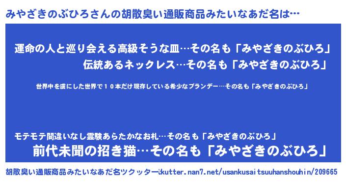 | 意味不明あだ名 | 『住所不定無職みやざきのぶひろ(98歳)』 |