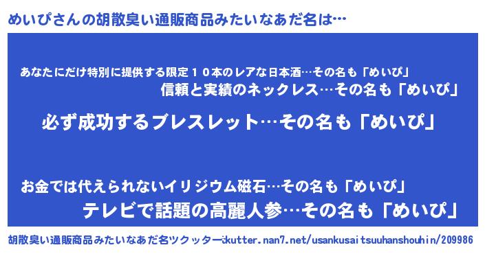 | 意味不明あだ名 | 『ペロリンめいぴ』『自称めいぴ』 |