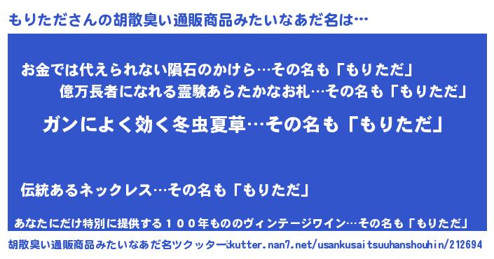 | 意味不明あだ名 | 『自称もりただ』『ヨモギ科もりただ属』 |