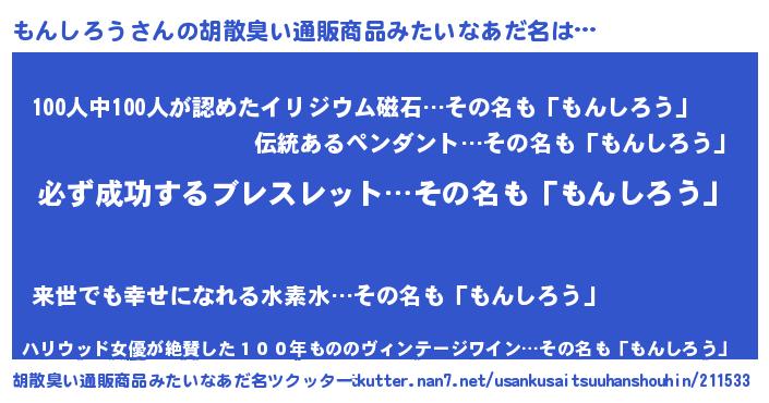 | 男性向けラノベタイトル風あだ名 | 『もんしろうの憂鬱』 |