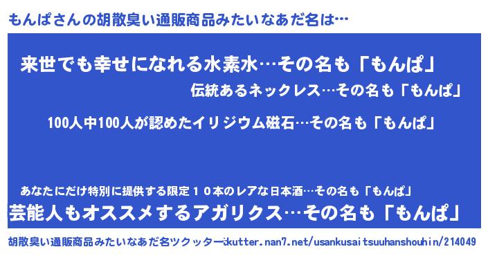 | ヘコむあだ名 | 『もんぱ(笑)』『もんぷりん』『豆乳』 |