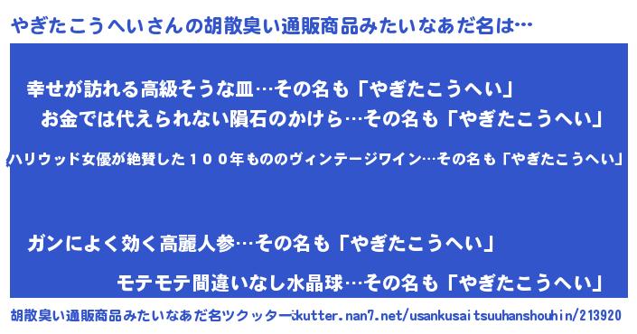 | 意味不明あだ名 | 『住所不定無職やぎたこうへい(6歳)』 |