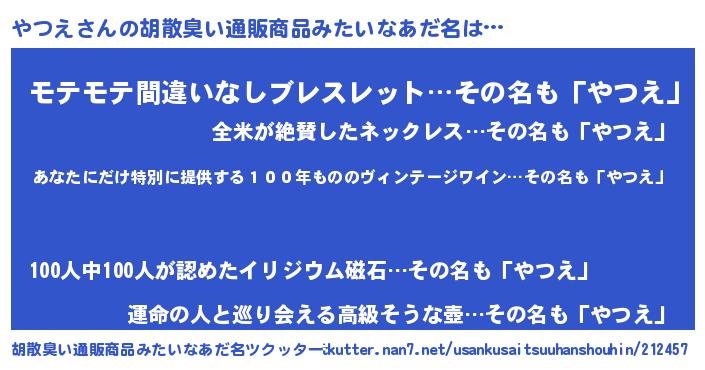 | 欧米人風あだ名 | 『ダレノガレやつえ』『マイケルやつえ』 |