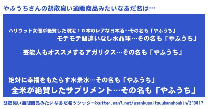 | 意味不明あだ名 | 『自称やふうち』『ペロリンやふうち』 |