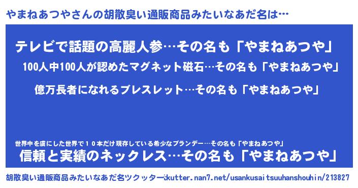 | 恥ずかしいあだ名 | 『プリティーやまねあつや』『やまちん』 |