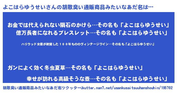 | 意味不明あだ名 | 『住所不定無職よこはらゆうせい(9歳)』 |