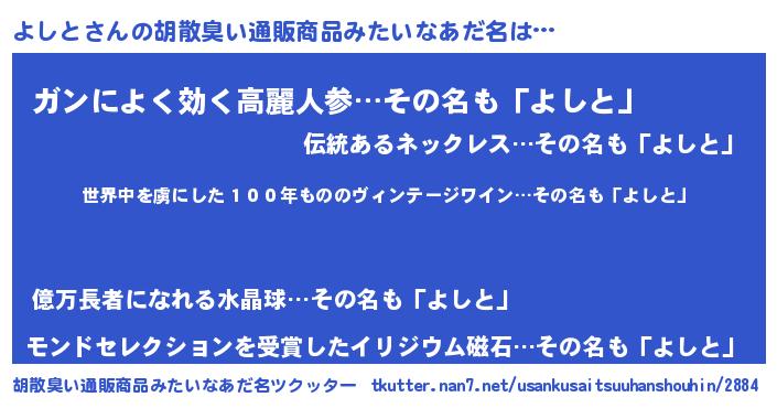 | ヘコむあだ名 | 『よし太郎』『よしにー』『なまこ酢』 |