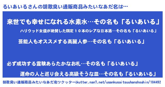 | 男性向けラノベタイトル風あだ名 | 『Re:るいあいるから始める異世界生活』 |