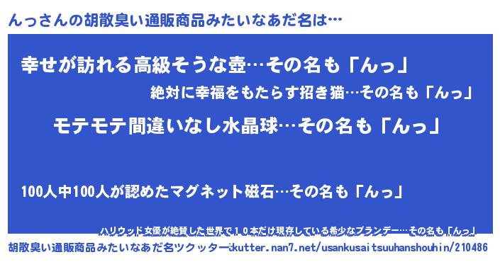 | 男性向けラノベタイトル風あだ名 | 『んっの憂鬱』『魔弾の王とんっ』 |