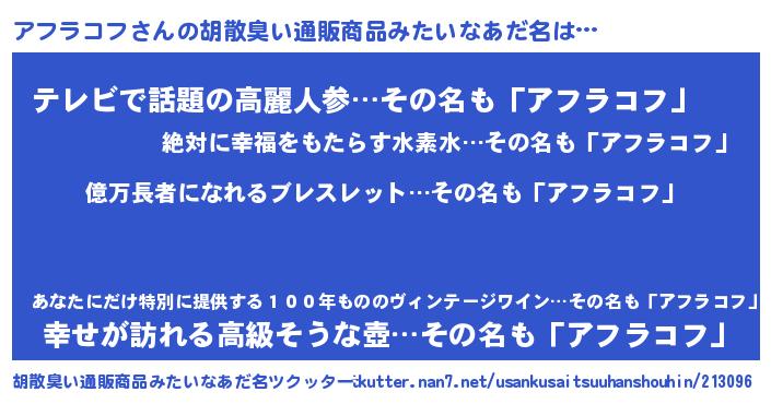 | 女子向けラノベタイトル風あだ名 | 『アフラコフの玉の輿計画!』 |