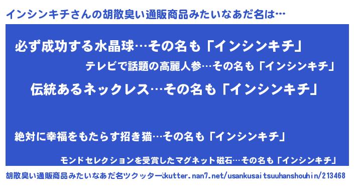 | 意味不明あだ名 | 『とにかく怪しいインシンキチ』 |