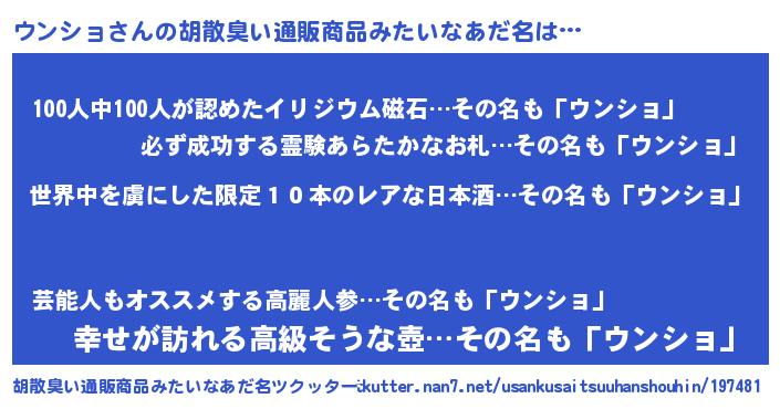 | 意味不明あだ名 | 『住所不定無職ウンショ(59歳)』 |