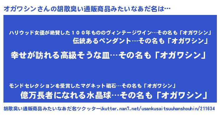 | 男性向けラノベタイトル風あだ名 | 『やはりオガワシンの青春ラブコメはまちがっている 』 |