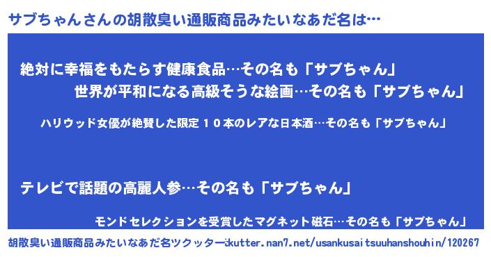 | ヒーロー風カッコイイあだ名 | 『仮面サブダー』『ネオサブチャン』 |