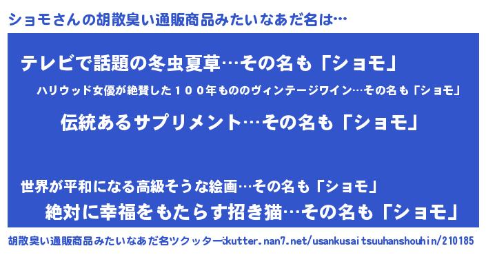 | 男性向けラノベタイトル風あだ名 | 『転生したらショモだった件』 |