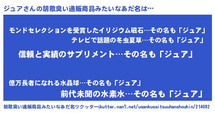 | 男性向けラノベタイトル風あだ名 | 『ダンジョンにジュアを求めるのは間違っているだろうか』 |